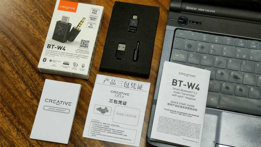 创新家的产品除了声卡之外,其它类别的产品接触的并不多。这款BT-W4的包装风格简约清爽,正面清晰直观的印有产品渲染图,在右上角清楚的标注可兼容PS4-5、任天堂Switch、PC、MAC等多种平台设备支持。通过底部可知它采用最新蓝牙5.2版本,支持最新的aptx Adaptive 编解码器,提升无线体验的同时享受不受干扰的24位高清音频,以及设备切换动能和便捷的语音聊天。