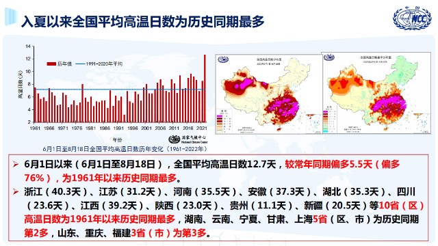 虽已立秋,但“三伏天”的“末伏”阶段,国内多地仍处于高温炙烤之下。根据国家气候中心监测数据,6月1日以来(6月1日至8月18日),全国平均高温日数12.7天,较常年同期偏多5.5天,为1961年以来历史同期最多。“全国有1832站(占所有国家级气象站的73.2%)日最高气温达到或超过35℃,其中,有1297站(占51.8%)日最高气温达到或超过38℃;665站(占26.6%)日最高气温达到或超过40℃,135站(占5.4%)日最高气温达到或超过42℃”,国家气候中心正研级高工、中国气象局气象服务首席专家叶殿秀对今年三伏天以来的国内高温天气进行总结,“35℃以上高温覆盖面积有536万平方公里;中东部地区有23个省(市)出现40℃以上高温,覆盖面积达136.5万平方公里,影响人口约2.9亿。”