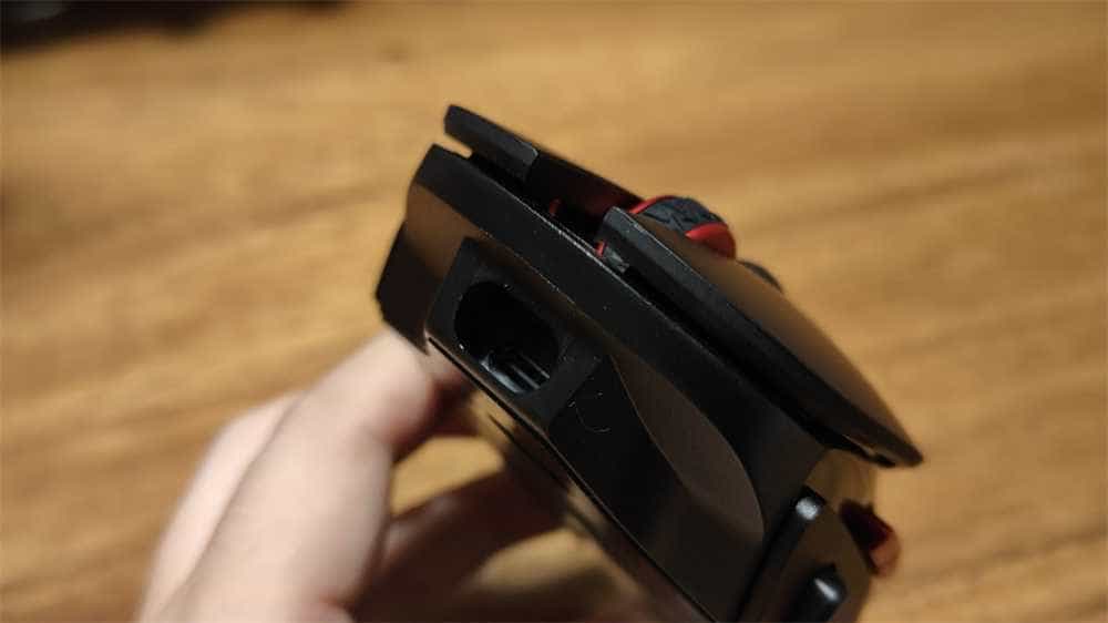 通过观察底部,可以看到鼠标为了散热及稳定考虑,在镂空位置采用了马蹄状设计,即保证鼠标使用过程中与桌面的摩擦面,还能保障空气与掌心的流畅接触。