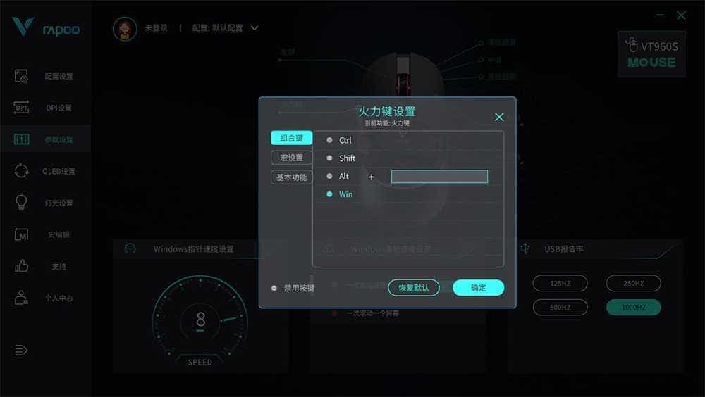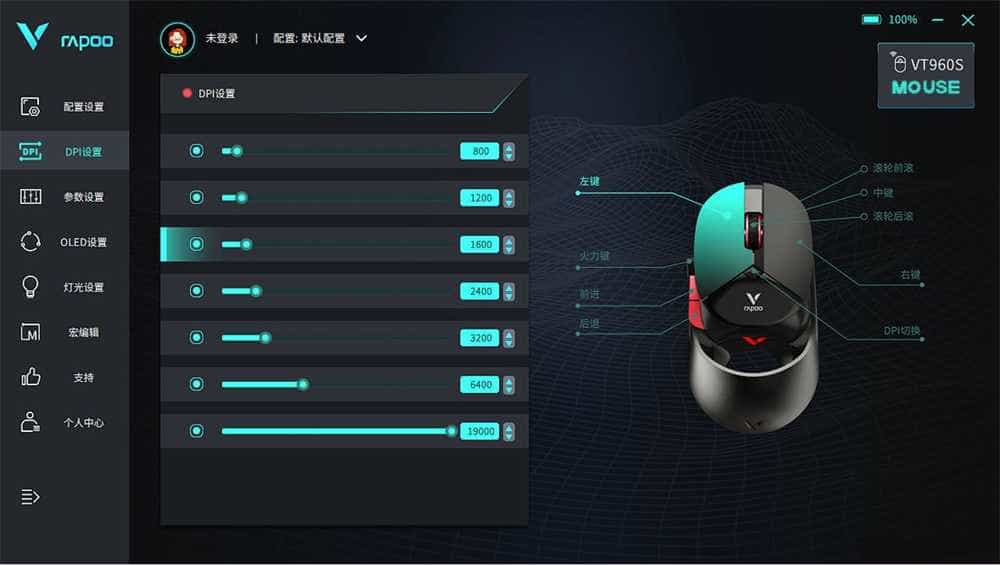 如果你对雷柏VT960S预设的7个默认DPI不满意,还可通过到官方下载驱动,在软件内对系统预设的7个DPI数值进行个性化调节,这样下次再按压鼠标的切换键时就会是自己设置后的DPI模式了。