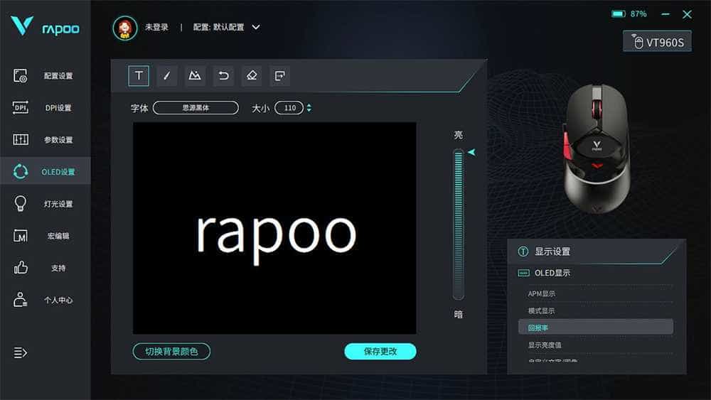 除了能够改动OLED屏幕显示的DPI数值,在软件中的OLED设置中还是根据用户喜好DIY出个性化文字以及图片画面,让你的VT960S成为专属你的个性化存在。