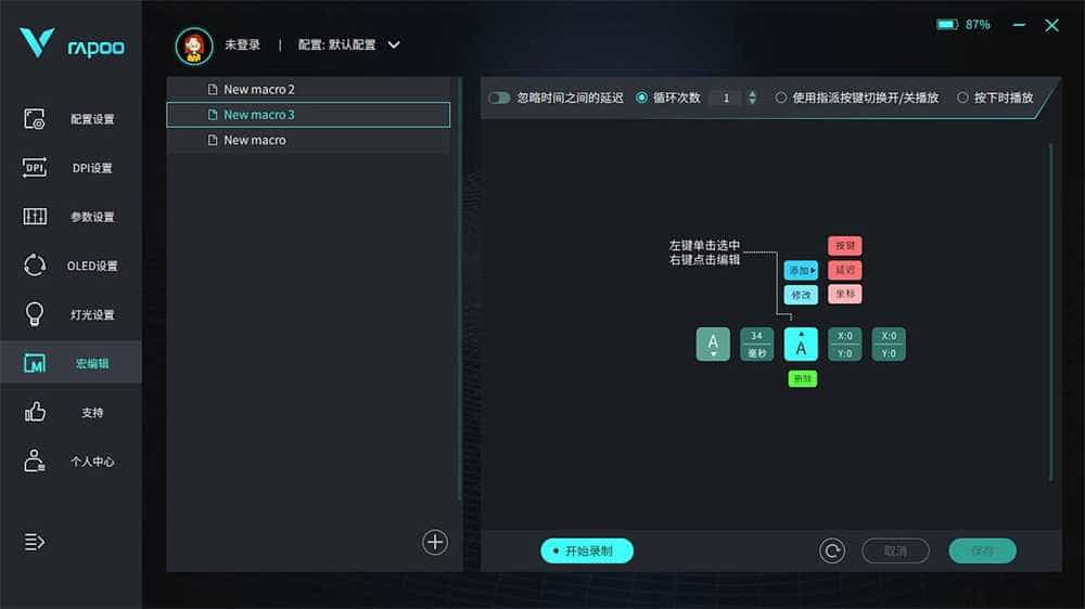 如果你想要的功能在参数设置中无法实现,那你可以切换到宏编程页面,在这里你可以通过图形交互形色进行快速编程,通过它实现一套指令集,这样就算在复杂的功能也都能让你一键即刻实现。