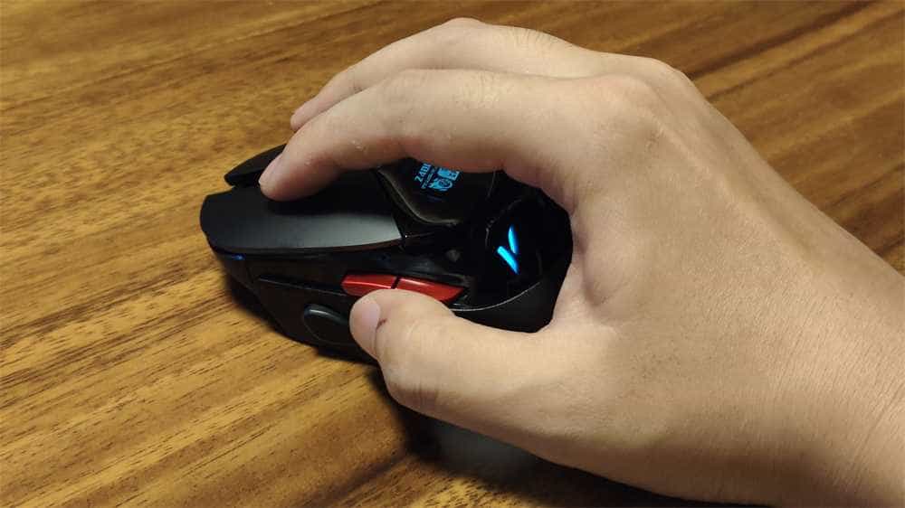 鼠标使用的握持效果,由于是拍摄角度的问题,在图片上看显得鼠标有些小,实际掌心部分正好嵌在镂空区域之上,并且鼠标整体采用的是标准尺寸设计。除非你拥有的是一双姚明那般的篮球大手,不然完全不用担心贴合问题。
