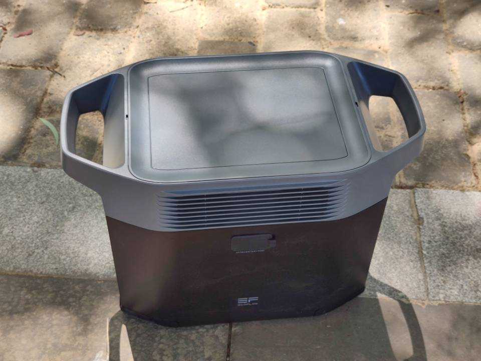 德DELTA 2户外电源两侧设计有两个空心把手就像人的两只耳朵,把手非常牢固而且都做了倒角处理便于双手平稳端起。一侧外壳上面有两个散热风扇孔下面印有英文logo。另外一侧外壳上面有栅栏式的散热孔和一个带盖子的加电包连接孔,整体非常简约时尚。