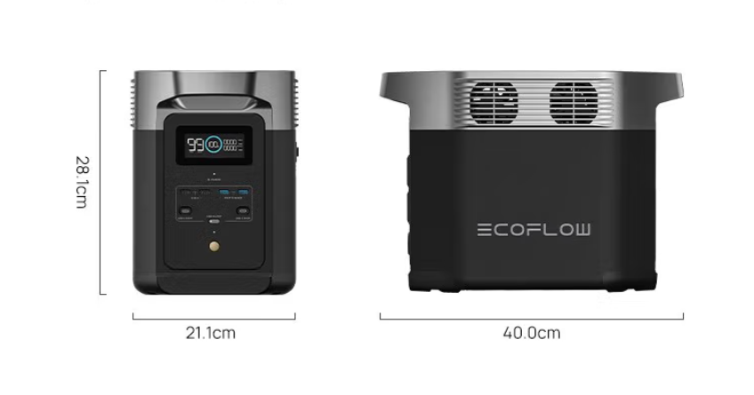 德DELTA 2户外电源尺寸适中,长40CM宽21.1CM高28.1CM,重12kg。双手端起来不费力,放营地车里尺寸刚刚好。