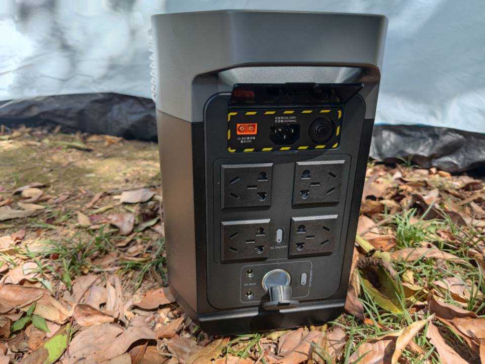 把手的另外一侧最上面为充电输入接口,需要打开盖子才能使用。从左到右分别为太阳能和车充充电接口,X-Stream充电接口,交流输入过载保护器。下面有四个交流插座可以接我们日常使用的家用电器。插座中间有一个交流输出电源开关,按一下会滴一声然后亮灯,交流插座开始供电。最下面还有一个DC5521输出接口,车充输出接口,同时也有一个开关进行控制。