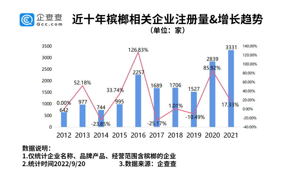 企查查数据显示,我国现存槟榔相关企业1.50万家。2022年上半年,我国新增槟榔相关企业705家,同比减少59.97%。2017年我国新增槟榔相关企业1689家,同比减少25.17%。2018年新增1706家,同比增长1.01%。2019年我国新增槟榔相关企业1527家,同比减少10.49%。2020年新增2839家,同比增长85.92%。2021年新增3331家,同比增长17.33%。
