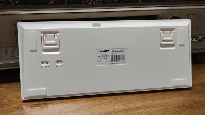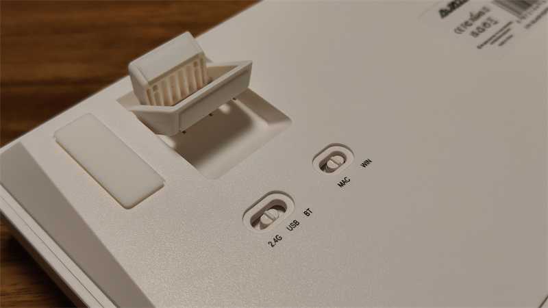 键盘背部可以看到采用两段式设计的脚撑,满足用户在不同环境下的使用体感需求。除此之外,在键盘右侧脚撑下方还设有2枚拨动开关,前者是三模式选择开关,后者则是用于系统支持MAC和Windows配置信号切换开关。日常使用时,系统间切换非常便捷,易识别操作。