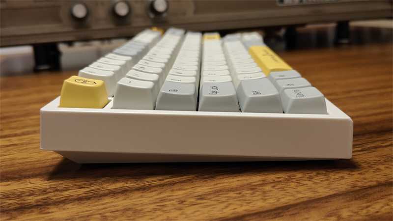 通过侧面观察,会发现按键整体布局呈现出一定的弧面效果,阶梯式缓升的设计在敲击时可以获得更佳的舒适感,让指尖能够获得更为欢快的敲击感。整体按键采用MDA高度的热升华PBT键帽,保证长时间的使用不掉色不打油。