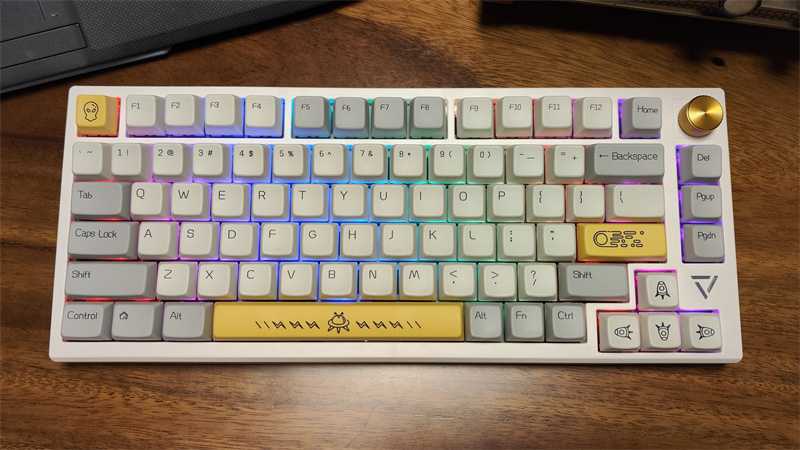 我入手的这款是【宇宙奇遇】,主体配色明亮好看,除了与主题遥相呼应的黑色大鼠标垫之外,配件里还包含了:一条A to C数据线、说明书、轴键拔轴器和三枚MAC增补键帽,以及一个透明防尘罩,配置可谓相当齐全。