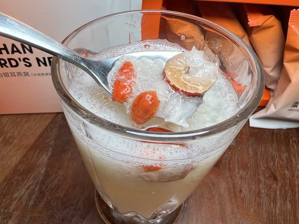 厘盏蛋白银耳燕窝食用很简单:200ml100度热水冲泡1-2分钟即可。这样马上就能快速享受营养燕窝。早晚各一袋,就可满足一天的营养所需。