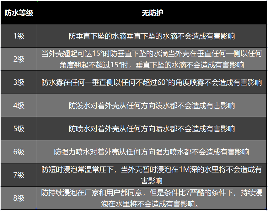 防水等级对应的防水性能如下表。