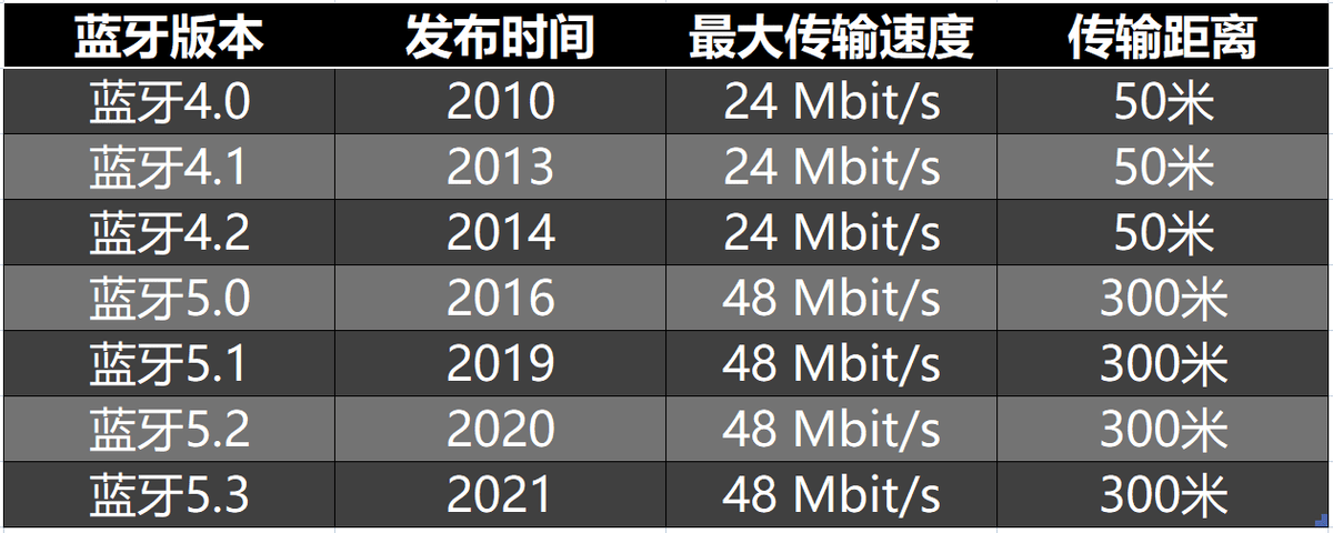 这里是每个蓝牙版本对应的性能。目前从蓝牙5.0开始到5.3,虽然传输速度和距离都没有变化,但是抗干扰、延迟及其他性能其实都随着版本迭代增强的。