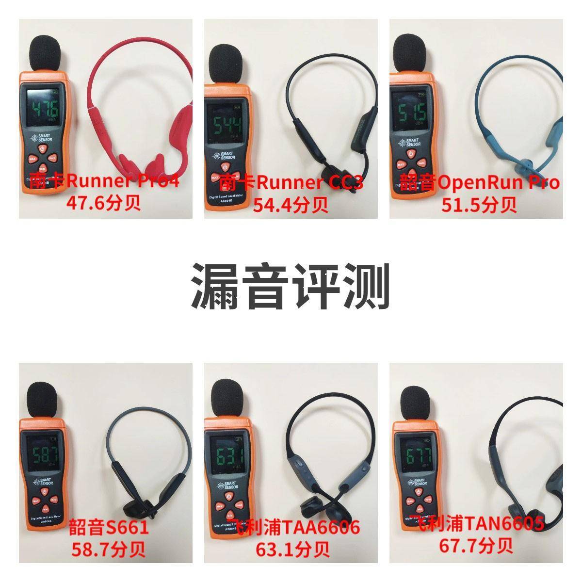 测试漏音最简单的方法,就是利用仪器去测量耳机泄露的音量分贝大小。(环境声40~45分贝)我把每款耳机都开到65%的正常电量,并且播放相同的声音片段,用测验仪器去得到数据并保存。漏音越小,也能代表这款骨传导耳机质量越好。