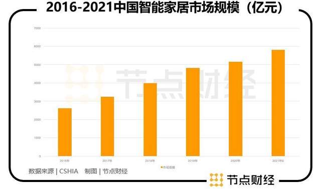 CSHIA数据显示,2016—2021年,我国智能家居市场规模由2600亿元增长至5800亿元,年均增长率近20%,远远超过家居市场整体增速;申万宏源亦在研报中指出,长期来看,与美国、欧洲多国家超20%渗透率相比,中国智能家居市场渗透率仅为4.9%,具有较大成长空间。