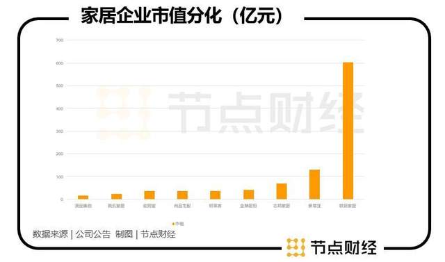 与业绩有同样走势的还有资本价值分化。截至10月21日收盘,欧派家居的市值超过600亿元,遥遥领先其他几家。