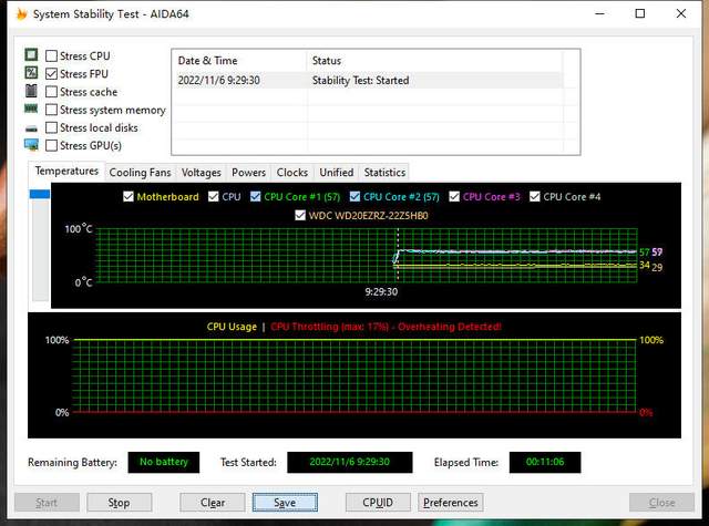 关闭AVX指令集、单拷FPU的条件下,拷机11min整体的温度在34~57℃内稳定运行,最高也没有超过60℃,这种表现着实到位啊!