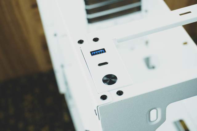 面板接口被安排在顶部,从使用习惯来看,更适合放于桌下,开关、插拔都比较方便。面板接口配置有USB3.0、TypeC、开关按键,这次并没有配备音频接口。3.5mm的接口,其实也是见仁见智,随着现在音频设备都在追求USB系列的数字接口,3.5mm的模拟信号正在逐渐趋于透明化。