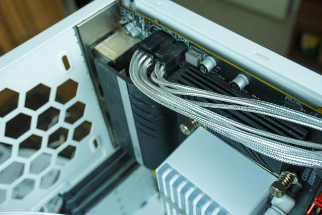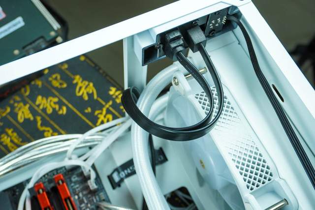装上水冷后发现,I/O面板部分的线材,如果是水冷下方绕行至主板的话,长度略有不足;所以弯折之后通过线孔至背板走线。