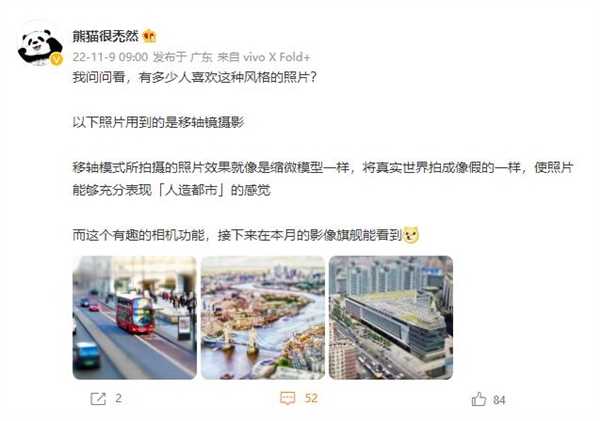 数码博主“熊猫很禿然”暗示,X90 Pro+将新增移轴摄影模式。