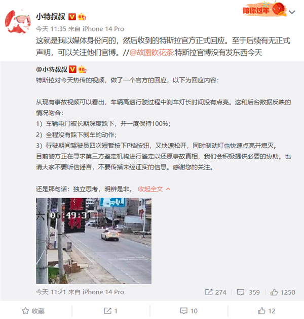 此事引起网友热议,11月13日,汽车博主“小特叔叔”发文称,他以媒体身份向特斯拉官方询问此事,后收到了特斯拉官方正式回应。