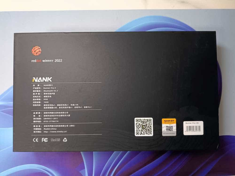 包装的背面先是red dot winner 2022,2022年获得德国红点全球最著名的工业设计大奖,再是品牌、型号、蓝牙版本等相关信息。