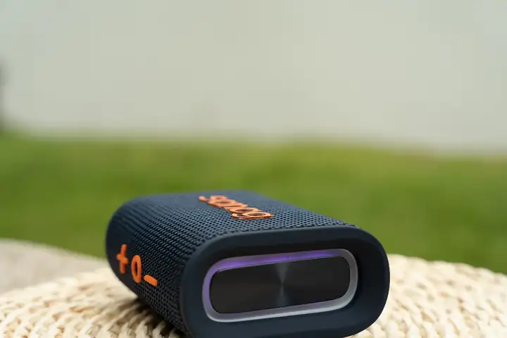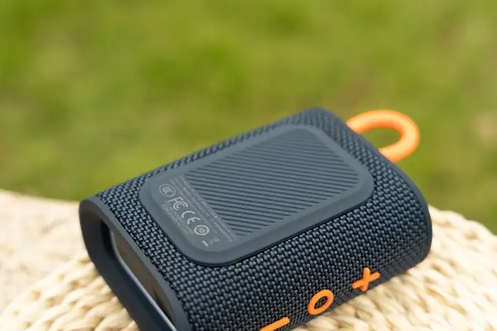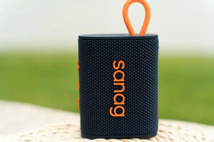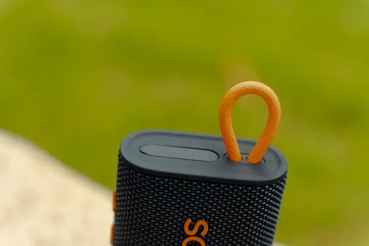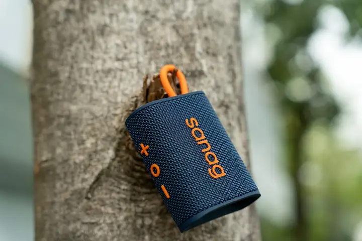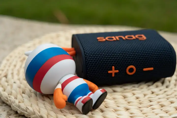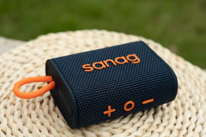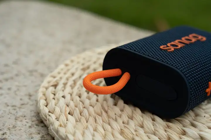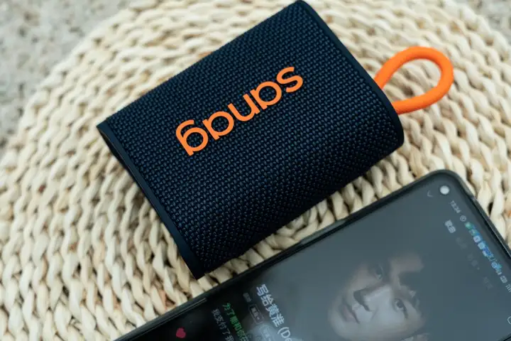 在音箱的主体部分,sanag塞那采用了编织的材质,加入了进口防水布艺,摸上去的手感十分舒服,不仅如此在视觉效果上更显高端,毕竟这可是经常得拿出去的数码产品,这一点为消费者考虑的很全面。机身上橙色的sanag LOGO、挂绳“点缀”其中,整体颜值瞬间拉到满!