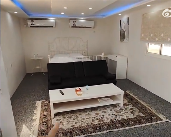 从视频画面来看,虽然只是集装箱,但其内部设施非常全面,沙发、床、衣柜、电视、淋浴间一应俱全。