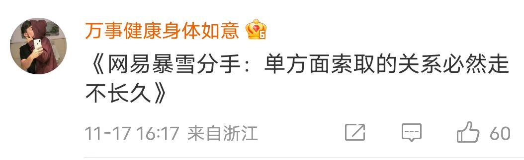 值得一提的是,对于这段分手故事,一部分网友在唏嘘曾经与暴雪游戏共度的时光。另一部分网友则纷纷为网易打抱不平,他们表示:“现在谁还看得起你暴雪”,“如今的网易三十年河东三十年河西”,“单方面的索取关系必然走不长久”。