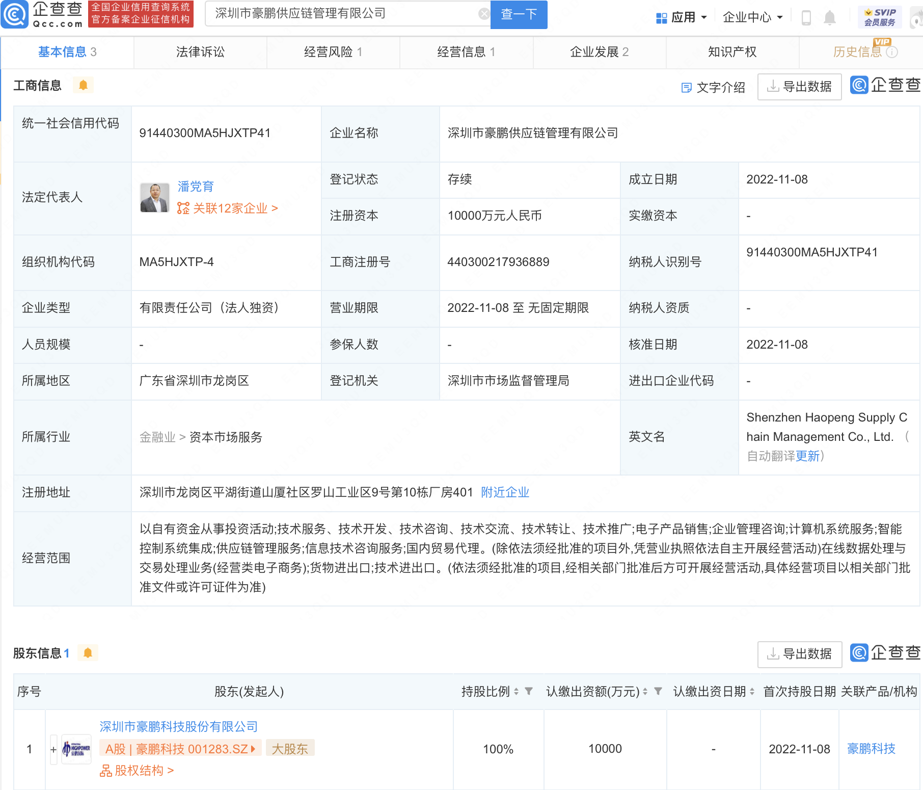 豪鹏科技新设供应链管理子公司,注册资本1亿元 互联网 22年11月25日 编辑 企查查财经 企业认证:企查查财经官方账号 取消关注 关注 私信 企查查APP显示,近日,深圳市豪鹏供应链管理有限公司成立,法定代表人为潘党育,注册资本1亿元人民币,经营范围包含:智能控制系统集成;供应链管理服务;信息技术咨询服务;国内贸易代理等。企查查股权穿透显示,该公司由豪鹏科技(001283)100%控股。 声明:该文观点仅代表作者本人,IT手机资讯系信息发布平台,仅提供信息存储空间服务。