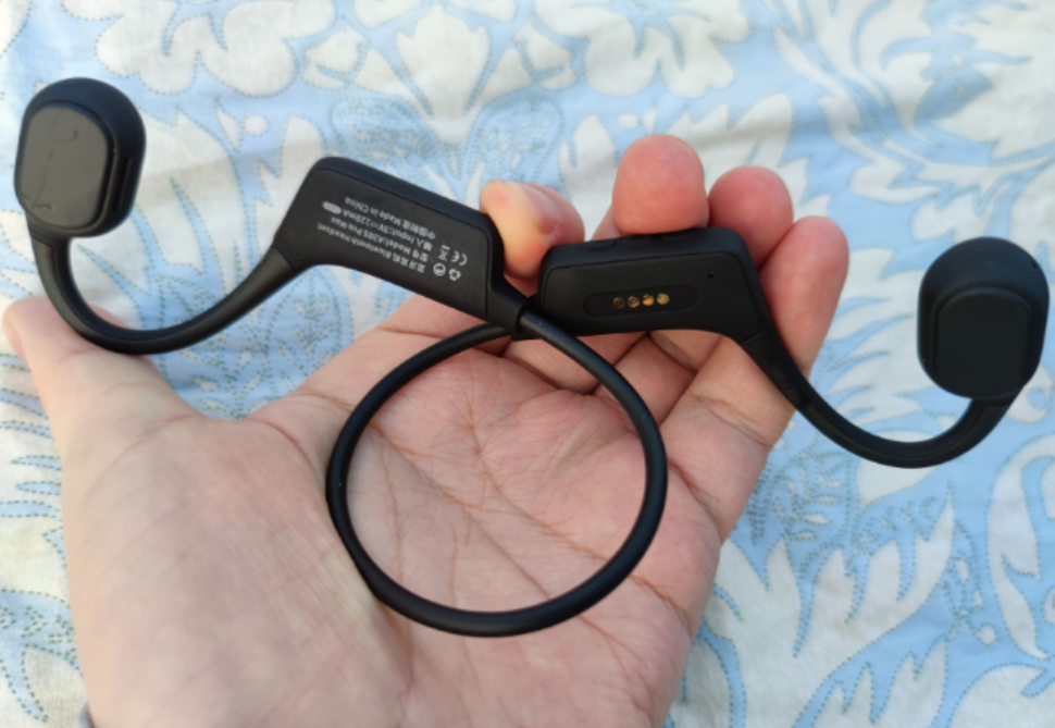拿到产品,首先看到的是一个长方形的黑色盒子。正面环绕这一圈环形外包装,左上角是sanag的品牌字样和logo,中间是灰色的耳机样图,耳机图片上有少许水滴,看图就知道它肯定是防水防溅的。从右下角的Sweat Proof 和 Gas Conduction标识也可以知道,它可以防水防汗,通过气传导发声。左下角是三个明显的金黄色标签,可以看出它使用了ACS全景声、数字声音增强技术和定向传音技术。打开盒子,看到黑色气传导耳机一副,取出来可以随意弯折,让都会记忆复原如初,丝毫不担心变形和损坏。最令人吃惊的是,它的充电器竟然和surface平板电脑类似,支持磁吸式充电,大大减少了磨损和线材损坏的可能。