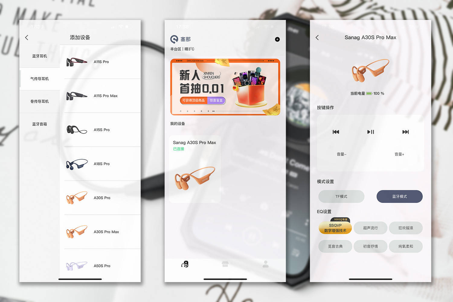 A30S Pro Max的声学基础应用了sanag塞那第四代360° ACS全景音技术,并且搭载了SSQVP EXTREME数字声音增加技术,最大限度补足了开放式耳机在音质上的短板,实际体验下来,除了低频稍欠一些厚度之外,其它方面与入耳式耳机并没有特别明显的差距,运动时使用,可可以获得非常不错的听感,即使是日常通勤,也能够轻松驾驭。