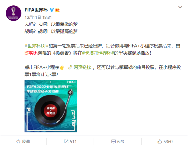 近日消息,FIFA世界杯官博的世界杯DJ活动第一轮投票结果出炉,陈奕迅演唱的《孤勇者》、苏打绿演唱的《相信》,将在本届世界杯半决赛现场播放。