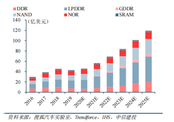 据统计,2020年全球车载存储市场规模约46亿美元,在整体存储市场占比不足5%,但成长速度较高,2016-2020年复合增速为11.4%,预计随着汽车智能化水平的提升,车载存储市场提速增长,主要体现在DRAM(尤其是新能源车用的 LPDDR)、NAND等需求高速增长,2021年车载存储市场将达到56.6亿美元,2025年增长至119.4亿美元,2021-2025年复合增速为21.0%。从结构看,车载存储市场以DRAM和NAND为主,占比分别为57%和23%,其他小类的存储芯片如NOR Flash、SRAM和EPROM/EEPROM也在车内有广泛应用。不难预测,伴随汽车智能化驱动数据存储需求增加,车载存储市场有望提速增长。