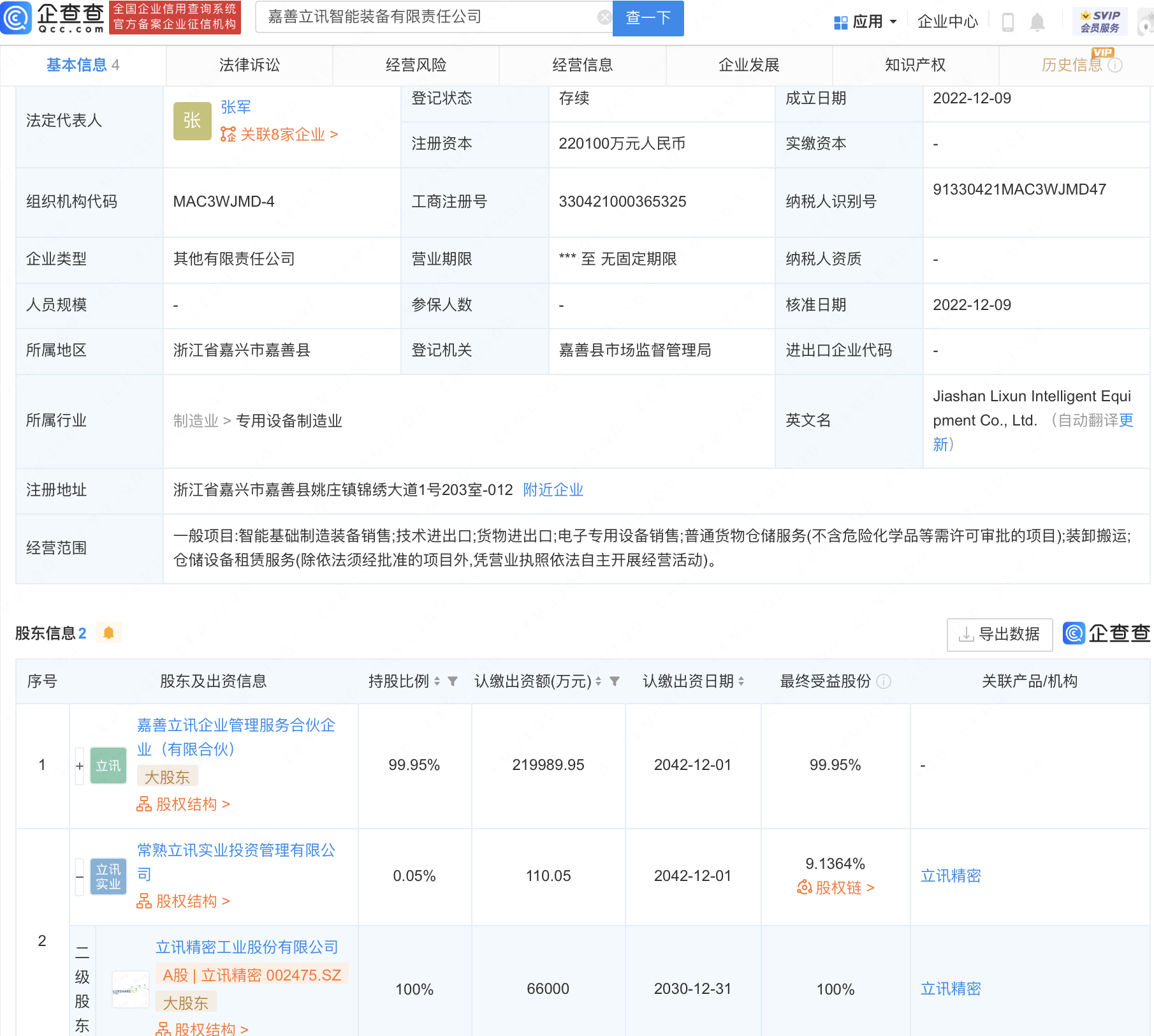 立讯精密投资设立智能装备公司,注册资本22亿 互联网 22年12月20日 编辑 企查查财经 企业认证:企查查财经官方账号 取消关注 关注 私信 企查查APP显示,近日,嘉善立讯智能装备有限责任公司成立,法定代表人为张军,注册资本22.01亿元人民币,经营范围包含:智能基础制造装备销售;电子专用设备销售;普通货物仓储服务等。企查查股权穿透显示,该公司由立讯精密(002475)全资子公司常熟立讯实业投资管理有限公司、嘉善立讯企业管理服务合伙企业(有限合伙)共同持股。 声明:该文观点仅代表作者本人,IT手机资讯系信息发布平台,仅提供信息存储空间服务。
