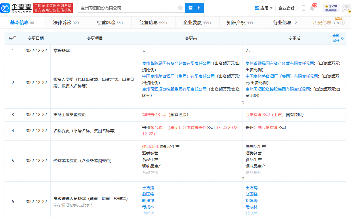 企查查APP显示,近日,贵州茅台酒厂(集团)习酒有限责任公司发生多项工商变更,名称变更为贵州习酒股份有限公司,企业类型从有限责任公司(国有控股)变更为股份有限公司(上市、国有控股)。企查查信息显示,该公司成立于2000年8月,法定代表人为张德芹,注册资本12亿人民币,现由贵州习酒投资控股集团有限责任公司、贵州省黔晟国有资产经营有限责任公司、中国贵州茅台酒厂(集团)有限责任公司分别持股57%、25%、18%。