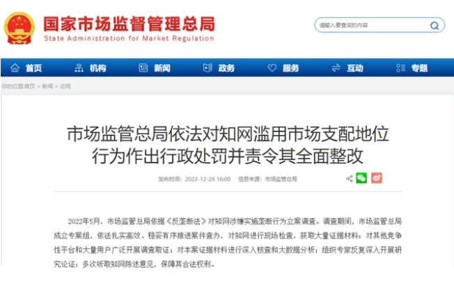人民网消息,日前,国家市场监管总局公布对对知网涉嫌实施垄断行为调查结果,对于该案,根据《反垄断法》第五十七条、第五十九条规定,综合考虑知网违法行为的性质、程度、持续时间和消除违法行为后果的情况等因素,市场监管总局依法作出行政处罚决定,责令知网停止违法行为,并处以其2021年中国境内销售额17.52亿元5%的罚款,计8760万元。