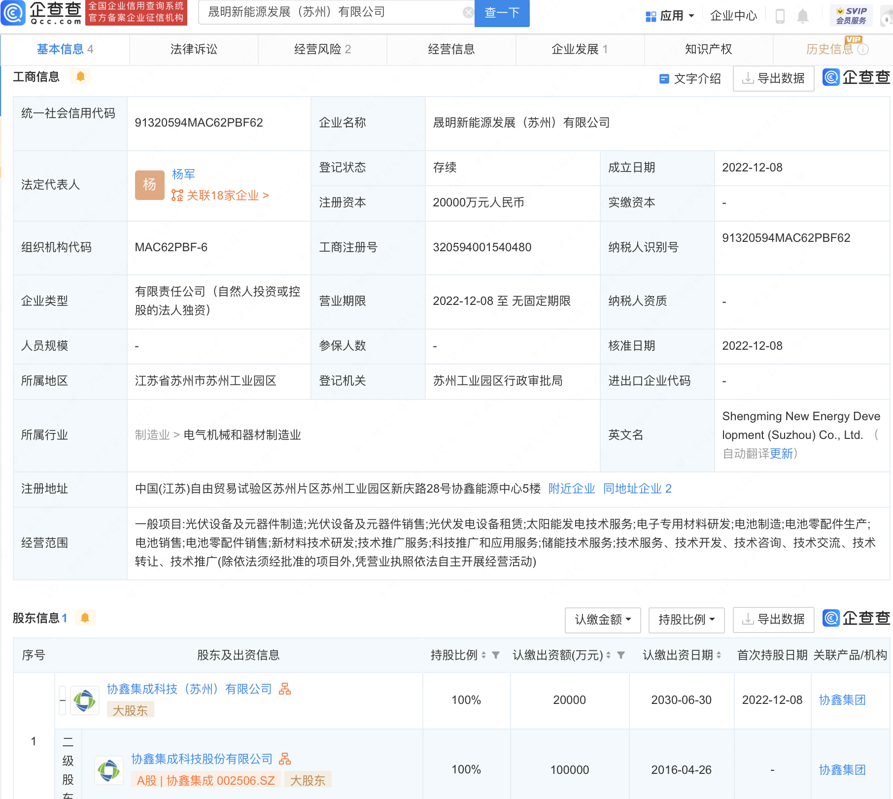协鑫集成2亿元投资设立新公司,经营范围含电池制造 互联网 22年12月28日 编辑 企查查财经 企业认证:企查查财经官方账号 取消关注 关注 私信 企查查APP显示,近日,晟明新能源发展(苏州)有限公司成立,法定代表人为杨军,注册资本2亿元人民币,经营范围包含:光伏设备及元器件制造;太阳能发电技术服务;电池制造;储能技术服务等。企查查股权穿透显示,该公司由协鑫集成(002506)间接全资控股。 声明:该文观点仅代表作者本人,IT手机资讯系信息发布平台,仅提供信息存储空间服务。