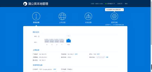 蒲公英X5的设置界面跟一般的路由器差不多,分别有系统信息、上网设置、本地设备以及更多四大项功能。
