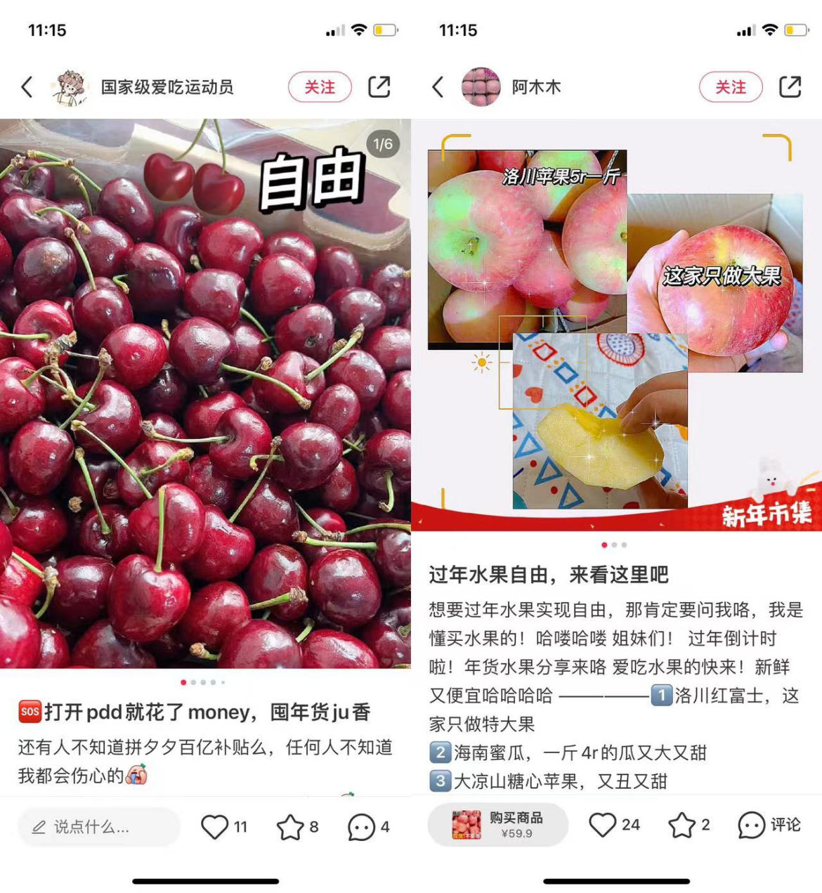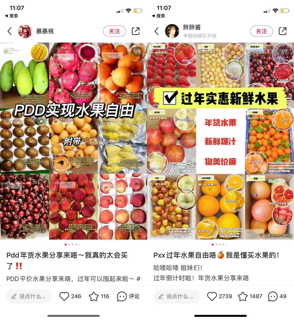 有个名为“国家级爱吃运动员”的网友,则是为全国人民年货水果自由操碎了心。在笔记中除了晒出又大又红的车厘子,还表示如果还有人不知道拼多多的百亿补贴,自己会很伤心的。