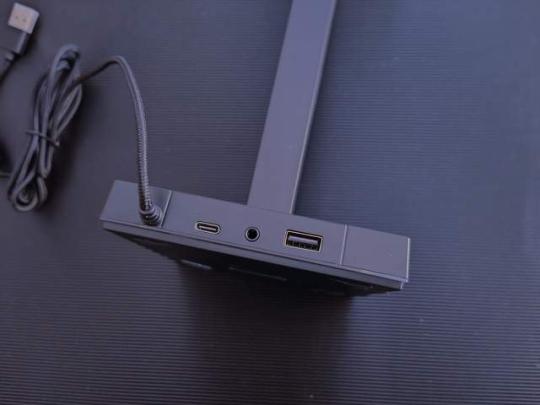 在耳机支架的背面,底座接口如图从左到右依次为Type-C 2.0接口、3.5mm音频(耳机麦克风二合一)接口、USB2.0接口,三种不同的扩展接口可以给用户提供不同的设备连接方式,而且接口还支持数据传输和音频传输,日常使用非常方便,对于电脑接口不够用的人来说,一举两得。