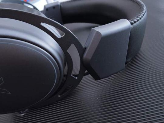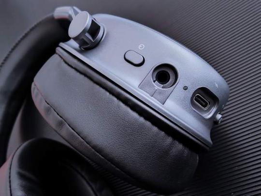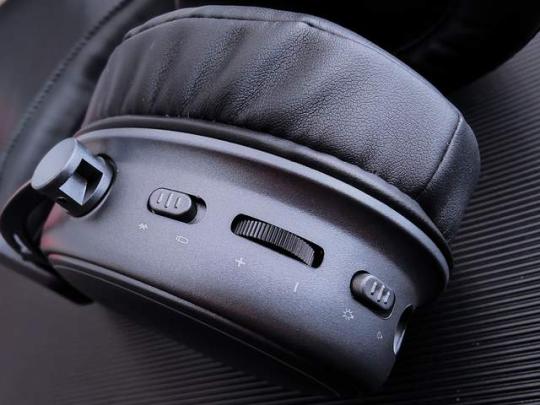 在左侧耳机侧边带有多功能耳壳操控设计,各种功能按键如图依次为高速无线连接/普通无线连接切换开关、音量调节开关、背光开关、电源键、长杆麦克风插口、Type-C充电接口。