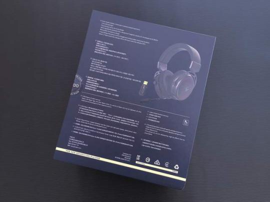 耳机包装背面罗列了雷柏VH800双模无线游戏耳机的主要产品特点,如LED背光灯、物理双音腔结构设计、40mm石墨烯复合膜、可拆卸麦克风等等,可以最大限度的为消费者提供购买参考。