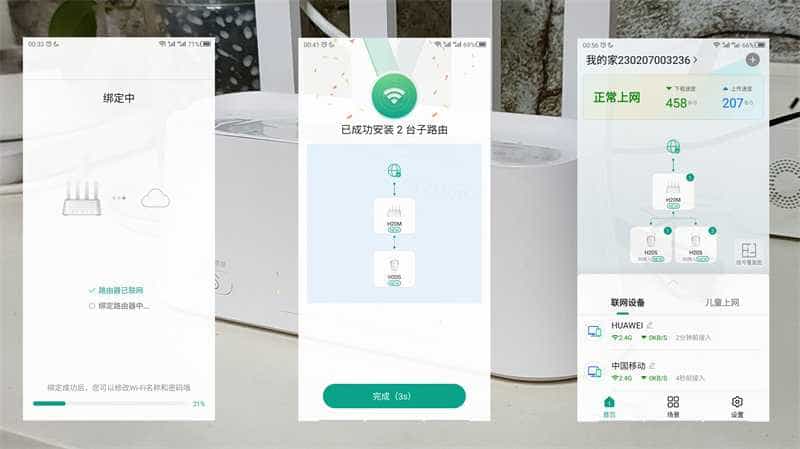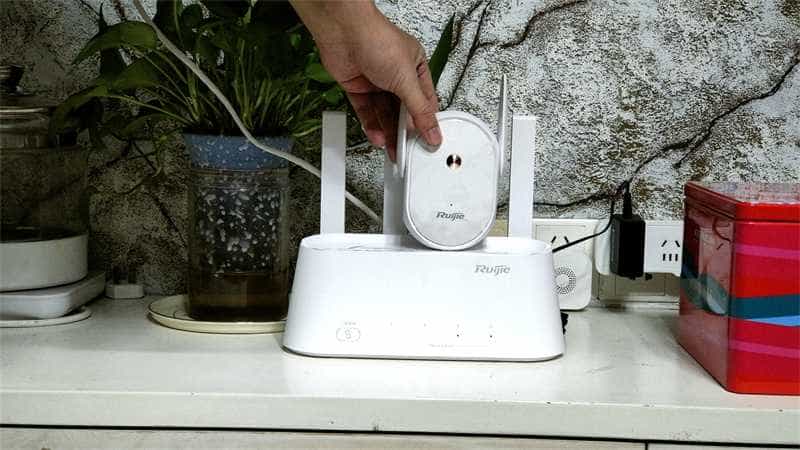 这款锐捷蜂鸟(1+2)其实出厂就做好了预组网,通电后设备即可完成自动组网。当然,如果后续有新增子路由是也可通过碰一碰增加组网范围,操作是将两者感应区互碰发出滴的一声即可移开,后续将新增子路由在主路由信号覆盖范围下的任意插座通电即会自动完成Mesh配网操作。