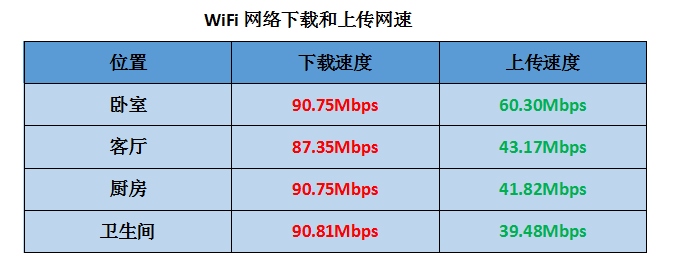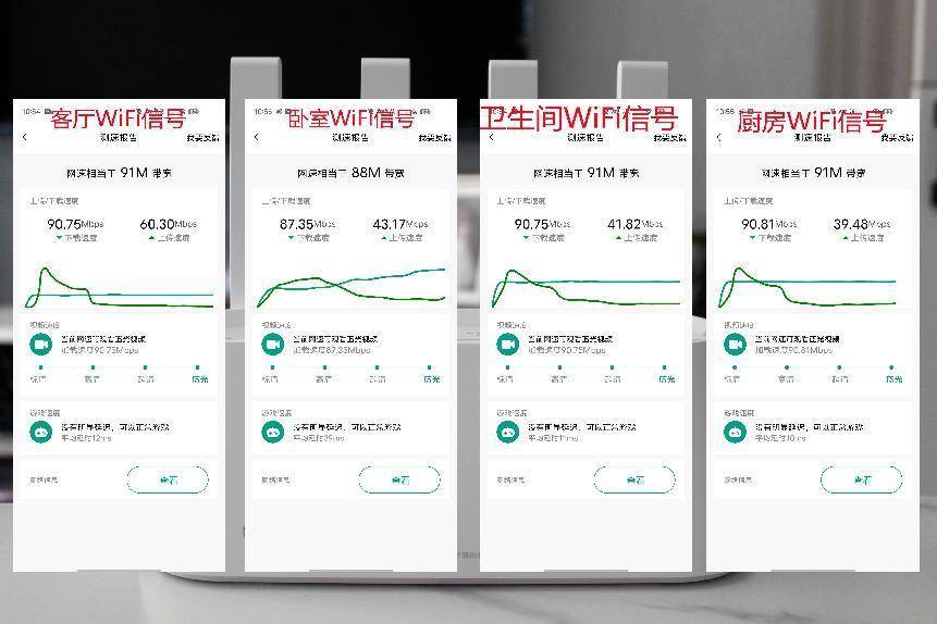 家里目前安装的宽带是天津电信100M光纤宽带,使用锐捷星耀APP自带的测速功能对家里的各个房间进行了测试,可以看到每个房间的下载速度都在90MB/S左右,而且每个房间的信号强度几乎相同,说明网络信号可以在全屋得到很好的覆盖,这样就不用担心网络因为穿墙而信号减弱了,做到了全屋信号满格。