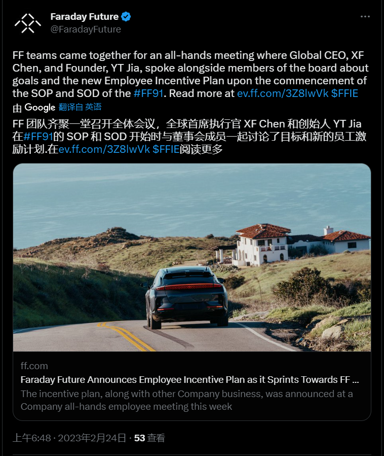 驱动中国2023年2月24日消息,据媒体报道,今日法拉第未来宣布了一项公司生产 (SOP) 和交付 (SOD) 激 励计划,旨在加速FF91 Futurist 的生产工作。
