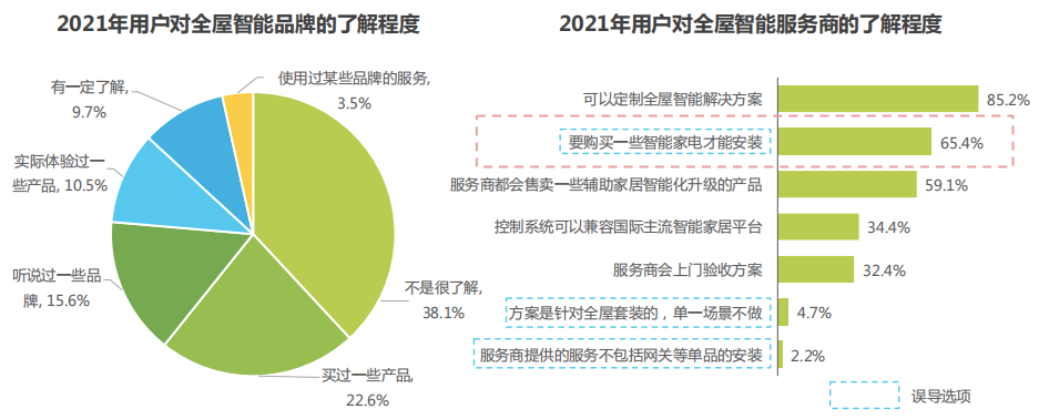艾瑞咨询《2021年中国全屋智能行业研究白皮书》显示, 固定方案难定制、产品品类不够丰富、售后服务不规范、覆盖场景不够全面、产品不够美观、安装工期不定等问题。