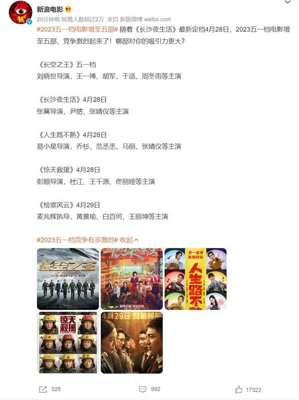 3月1日消息,随着《长沙夜生活》的定档,2023五一档电影增至五部,竞争瞬间激烈起来了,这五部电影分别如下: