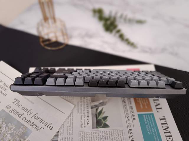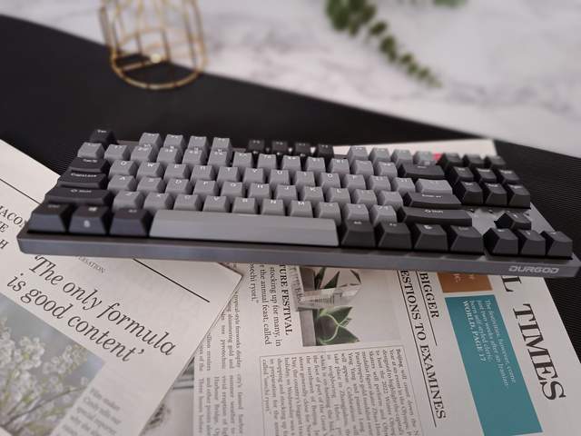 杜伽机械键盘K320,采用87键设计,其357.5*132.5*24.5mm的外形尺寸,占位较小,可以将桌面空间让给其它外设,富余活动空间;键盘深空灰配色,采用了墨灰+银灰色系,神秘低调,稳重内敛。