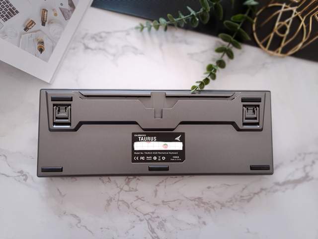 杜伽机械键盘K320表面采用精心调整的喷漆工艺,融合磨砂技术,整体呈现金属质感,提升档次;底座三向线槽设计,有线连接整齐有序,保持桌面整洁;底座双脚撑,同时附有五个防滑脚垫,平放在桌面上,稳固不滑;底盖中央则内嵌键盘信息。